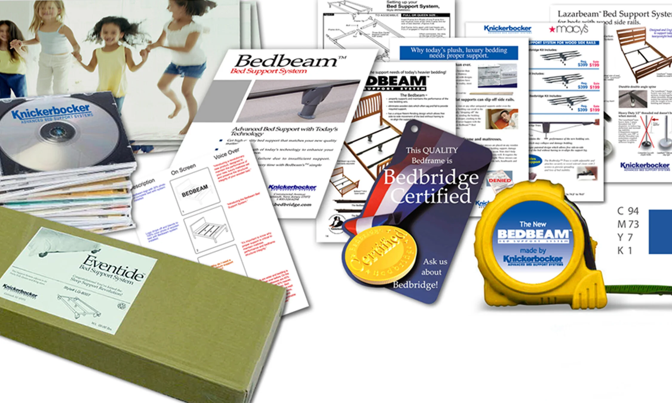 Printed sales materials put Knickerbocker Bed Company products in the hands of the retailer and help tell the story of how proper mattress support is essential for providing long-lasting bedding comfort. With our intimate knowledge of the Knickerbocker product line, Brownlie Design provides effective imagery and text for advertising, signage, sales training videos, and assembly instructions. We combine CAD-rendered images with photography for eye-catching results. In-store retail signage is an important component of sales success. With Brownlie Design’s artistic skills and established print vendor relationships, we have the ability to produce effective in-store advertising.